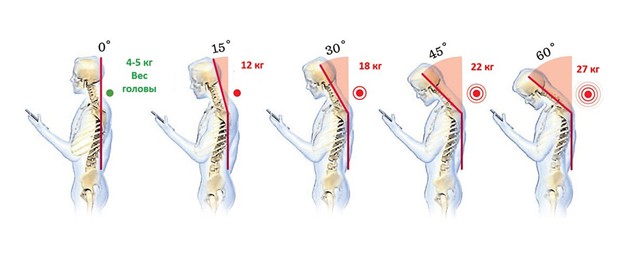 Ученые установили, что наклоняя голову вперед всего на 15 градусов, мы увеличиваем нагрузку на позвоночник до 12 кг. При наклоне головы в 30 градусов этот вес составляет 18 кг, 45 градусов – 22 кг, а 60 градусов – целых 27 кг!