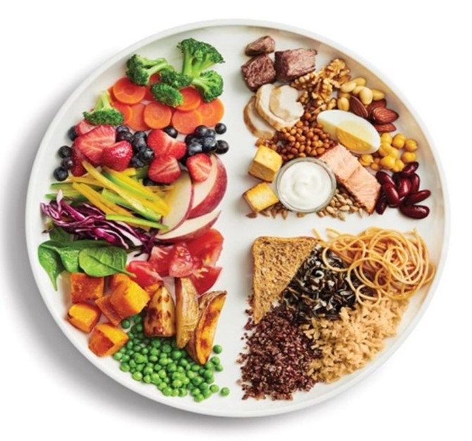- Разнообразие. Рацион должен быть разнообразным, содержать достаточное количество белков, жиров, углеводов, витаминов и минеральных веществ в каждый основной прием пищи. Употребление рыбы два раза в неделю, снижает риск сердечно-сосудистых заболеваний. Следует обратить внимание на трансжиры, которых достаточно в фастфудах, которые вредны для организма человека. Сократить потребление жиров можно, если: жирное мясо заменить на рыбу, птицу, бобовые или нежирное мясо; выбирать продукты с низким содержанием жира (но не обезжиренные); перед приготовлением мяса или птицы удалять жиры и кожу; выбирать способ кулинарного приготовления без использования масла (на пару, отваривание, запекание, тушение).